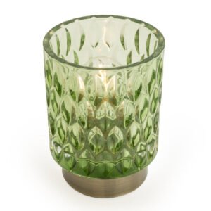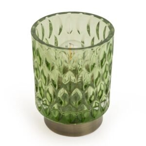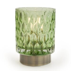This table lamp features an embossed green glass shade paired with a brushed gold base. Compact and cordless, it runs on 2 × AAA batteries (not included) and is fitted with an integrated LED light.
